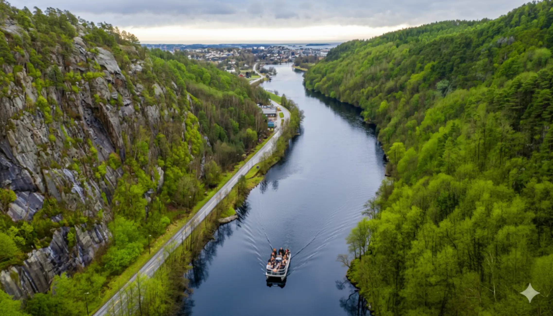 Join us for a peaceful journey past Christiansholm Fortress into the serene river landscapes. Experience nature from the city’s only premium pontoon boat, surrounded by green hills and wildlife. History and Nature Combined The adventure begins as we cruise past the historic Christiansholm Fortress. You will get a great view of the old stone walls and cannons that have guarded the city and the river mouth for centuries. As we leave the harbor behind and glide up the river, the landscape changes completely. We enter a peaceful world surrounded by fascinating mountains covered in lush green forests. The trees reflect in the calm, clear water, creating a beautiful emerald atmosphere. Wildlife and Heritage Keep your eyes open as you navigate the river. If you are lucky, it is possible to see wild salmon jumping near the boat. Especially during the summer months (June to August), you might witness a glimpse of the salmon’s incredible journey as they migrate up the river to spawn. This waterway also has a rich history. In former times, the Otra was used for log floating. It served as the main transport route for heavy timber, floating logs from the deep forests down to the coast to build ships and houses.